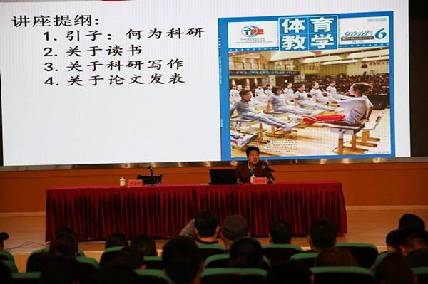 王子朴教授首先从读书说起,强调读书的重要性:读书对科研、对人生有着极其重要的作用,指出读书是做人和论文写作的基础,希望师生多读书,读好书。而后,王子朴教授谈到学术期刊的产生,介绍了期刊的作用和意义,并以首都星空体育官网登录学报为例对我国体育学术期刊的现状进行了系统的分析。接着通过介绍核心期刊的特征、作用及基本功能引出学术期刊的基本规范、审稿规范及编辑规范,使师生对核心期刊及相关规范有了清晰的认识。